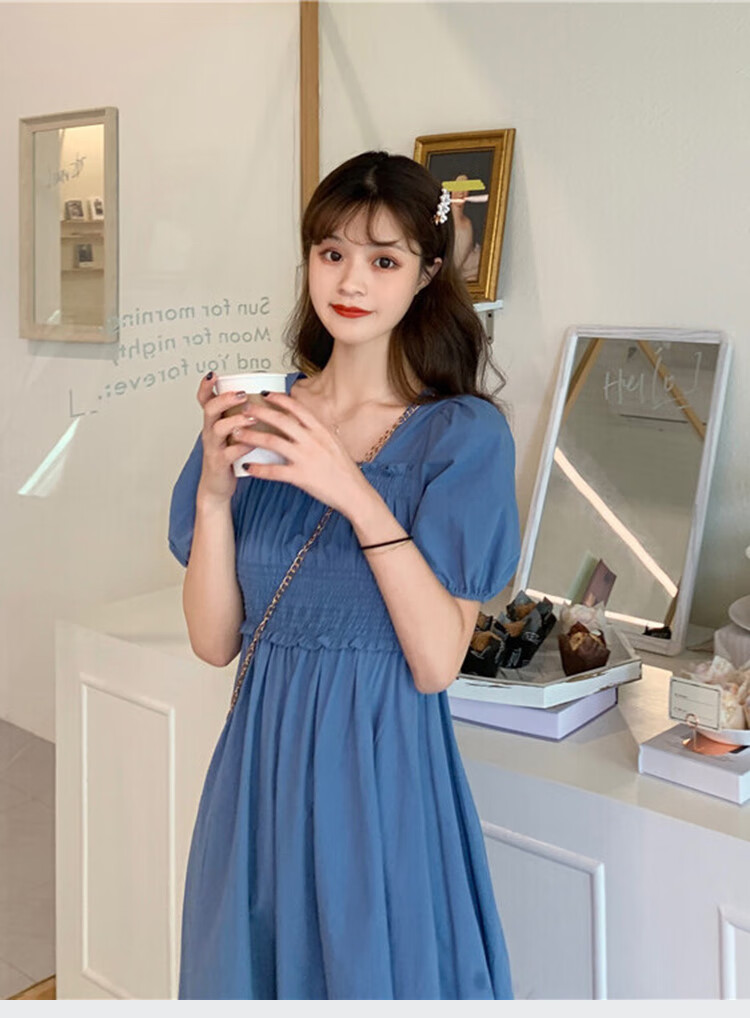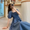 商品名称:FOURDATRY法式 连衣裙夏季2023新款复古过膝长裙显瘦泡泡方领夏季连衣裙子 浅蓝色 M建议 90-105斤